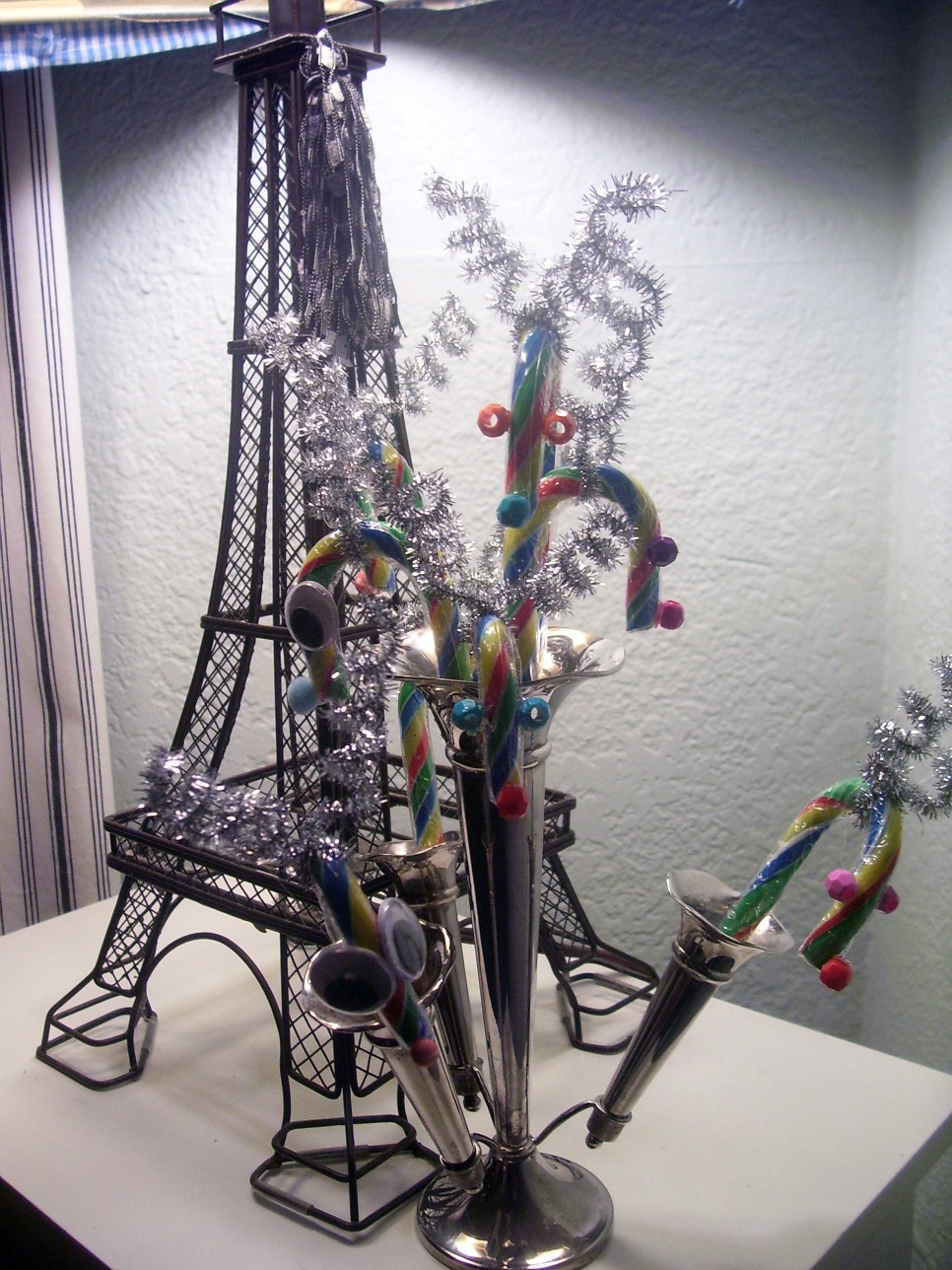 How do you like our herd? Eric wanted to give little treats to his friends at school tomorrow. At first we were just adding ribbon to these little darlings and then I remembered the old reindeer craft. It seemed appropriate that since these were pretty fancy candy canes they needed equally fancy antlers. Then we ran out of googly eyes and substituted these wonderful faceted bead. Too cute!
