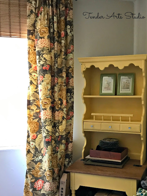 I used inexpensive wooden blinds from Big Lots to create a valance of sorts behind the curtains. I like the way it softened the area above the actual window. I really wanted the draperies to be high and wide and I LOVED the effect it created.