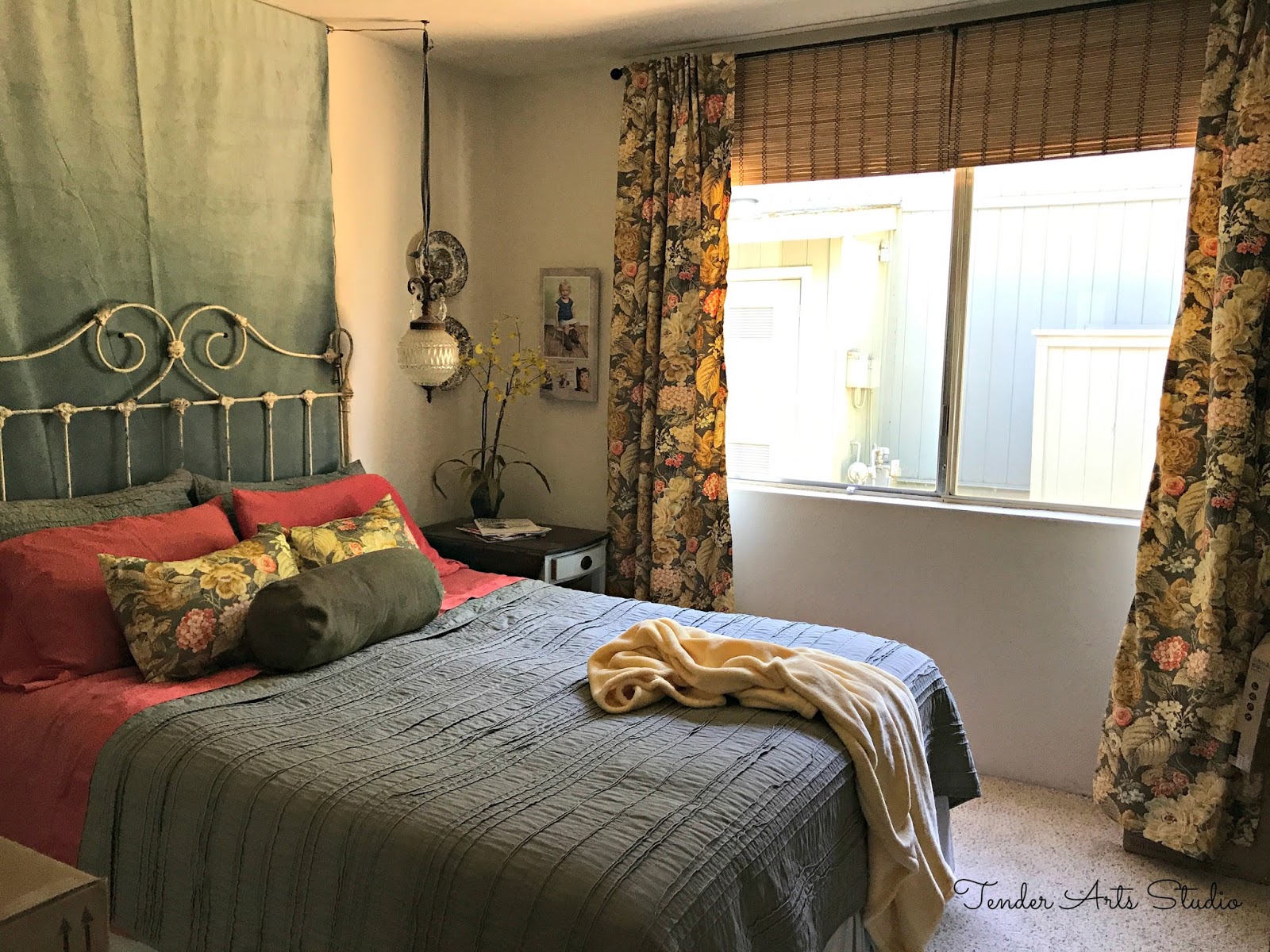 I went a little out of my comfort zone and used more and deeper colors than I usually would in a bedroom. I stumbled upon the very beautiful Waverly Flourish in Clay on sale for $10 at Hancock Fabrics (I sure miss that store!) and was inspired to use it. I lined the curtains with black out fabric because Pete was working a lot of midnight shifts at the time and I wanted to create an enveloping space to sleep in during the day.