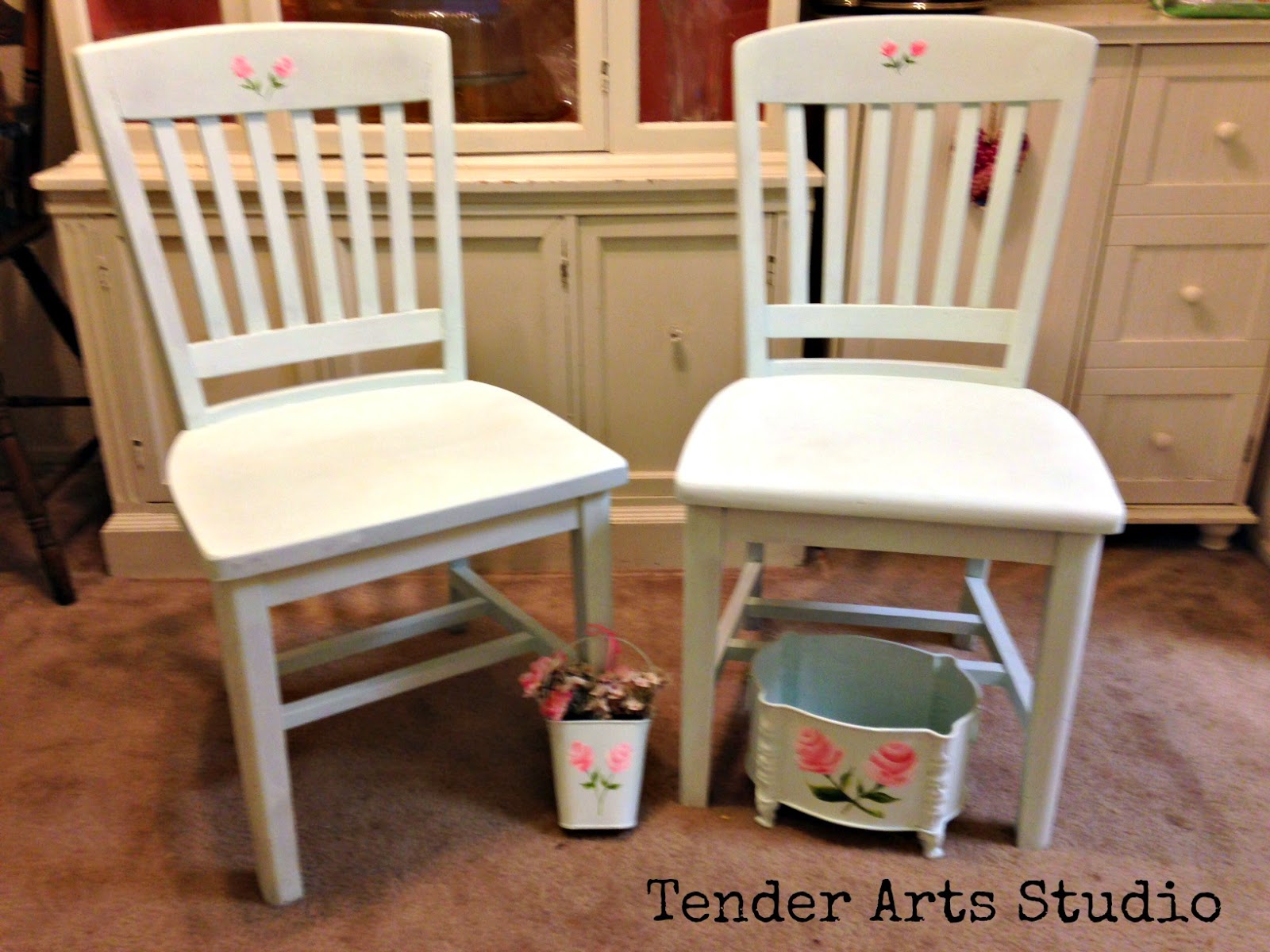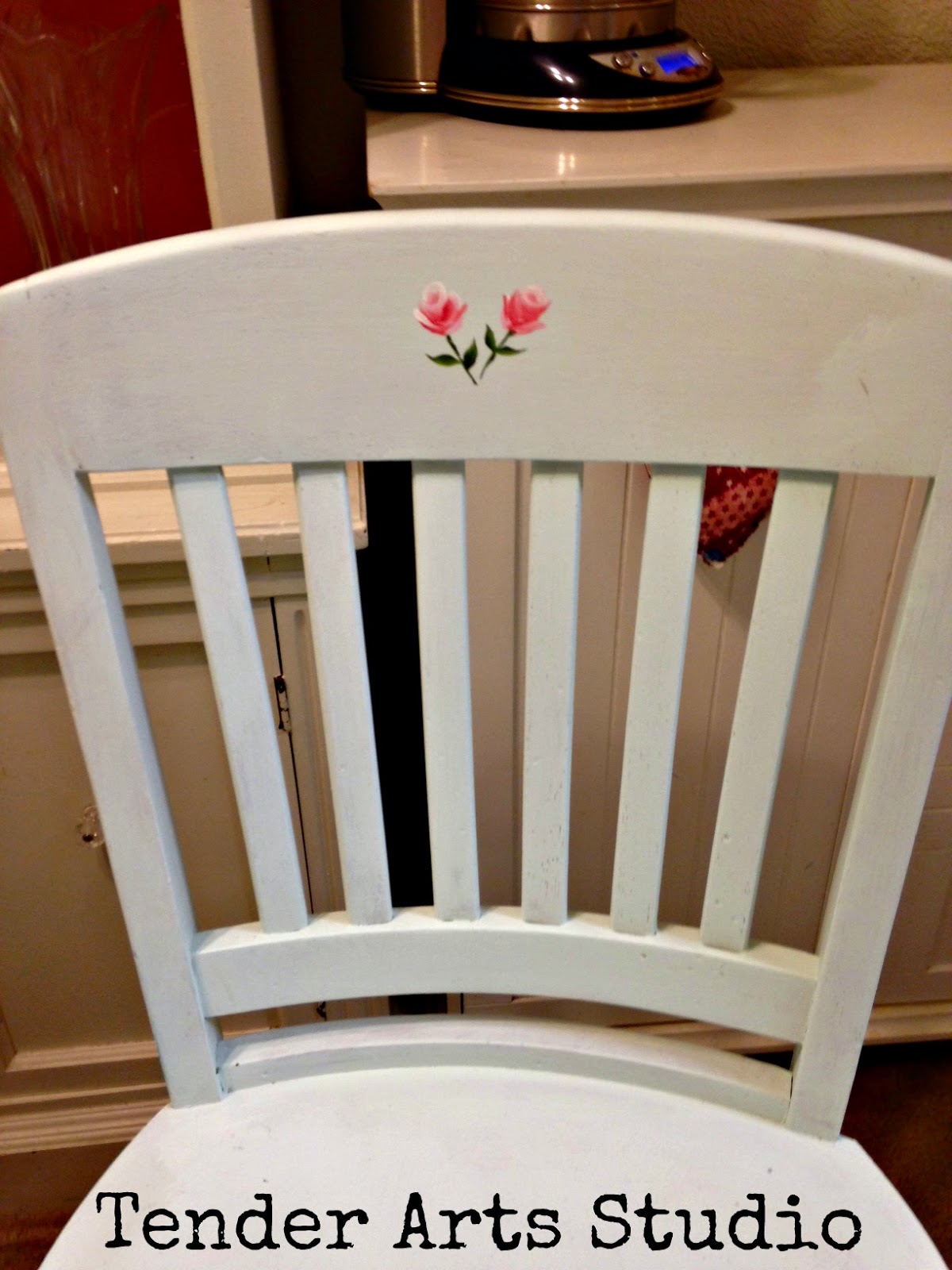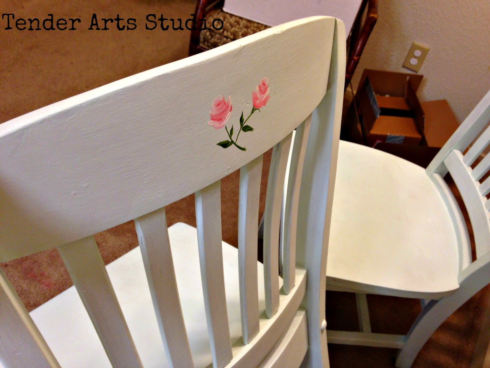 I studied all kinds of tutorials on You Tube and then went to work- one rose for Jamie, one for me on each item! And then… because I had invested so much time into learning, I painted them on the front of the chairs, the back of the chairs, on a magazine basket and a little flower bucket!